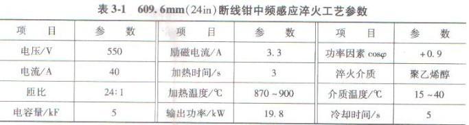 斷線鉗刀片是用GCr15鋼制造,刀口硬度要求55 -60HRC,其余部分的硬度為33~40HRC。刀片生產(chǎn)工藝流程為:鍛造成形一正火一球化退火一機(jī)械加工一調(diào)質(zhì)一中頻感應(yīng)淬火一低溫回火一磨刃一裝配。采用BPD100/8000型變頻機(jī)和DGF一C一108一2型中頻淬火控制設(shè)備。609.6mm(24in)斷線鉗中頻感應(yīng)淬火工藝參數(shù)如表3-1所示。
